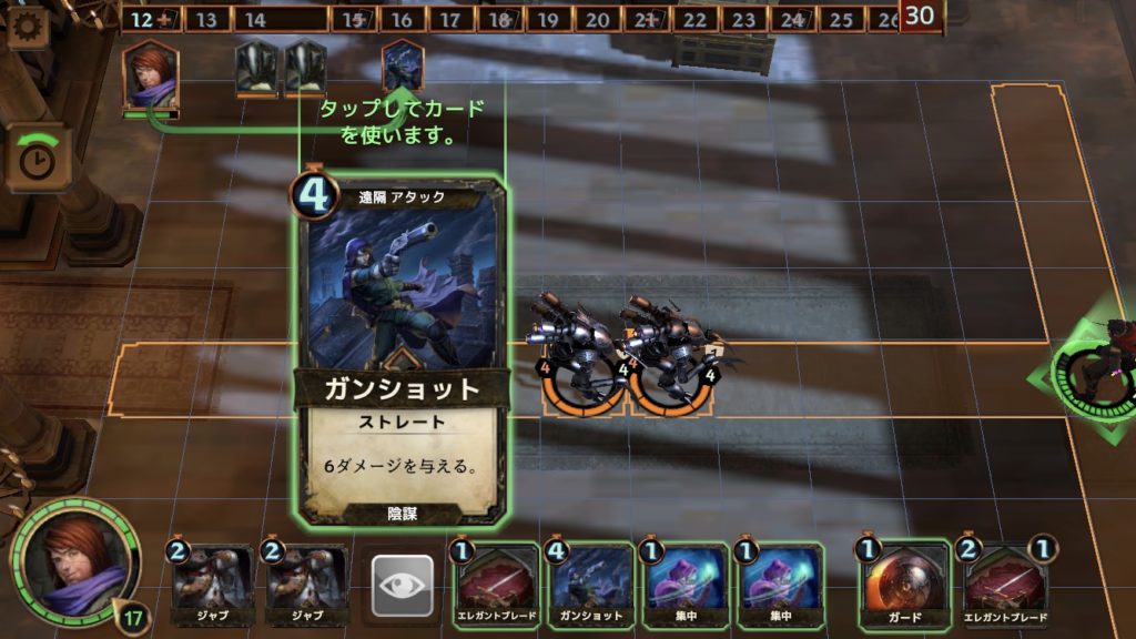 ガンショットはコストが4のため、敵の攻撃を2回受けないように、敵から4マス以上離れた状態で使いたい。