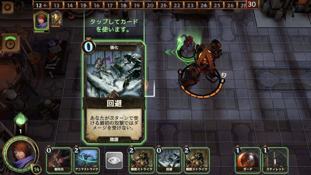 ここで、アニマストライクを使ってみる。そうすると、左下にアンプのアイコンが表示され、回避を除き、カードのコストが1減少していることが分かる。