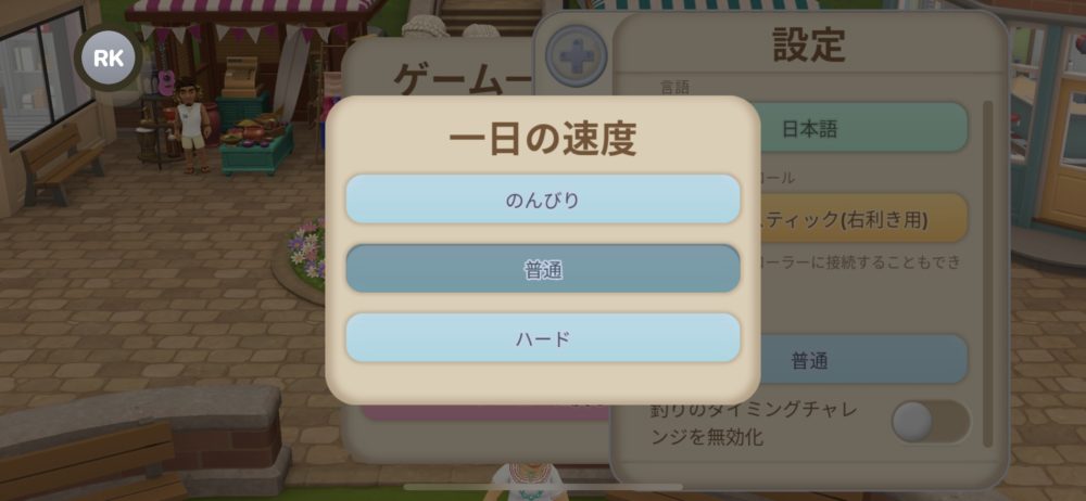「設定」をタップすると一日の速度が選べる。「のんびり」を選ぶと時間が進むのが遅くなり、「ハード」を選ぶと早くなる。