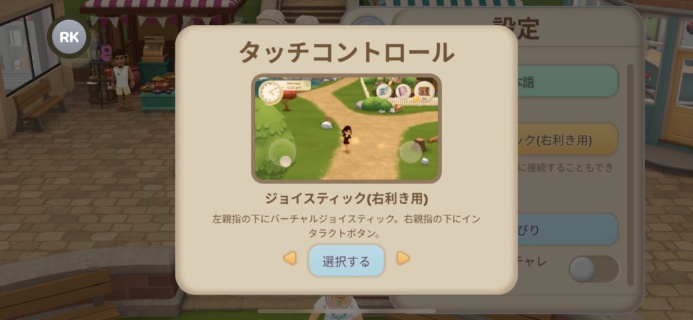 「操作」をタップすると、ターラの移動方法が選べる。右利き用または左利き用のジョイスティック方式など、4種類の移動方法が用意されている。