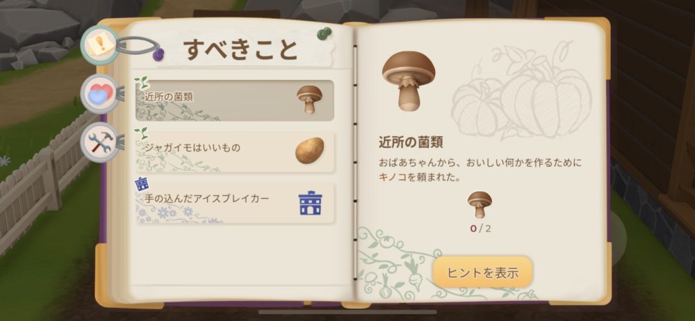 他にも人々からお願いを受けると、このように「すべきこと」でその内容を確認できる。右下には「ヒントを表示」のボタンがあり、初心者にも親切に作られていると思う。