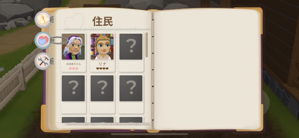 出会った住人はこのように確認できる。名前の下のハートマークは好感度を表していて、会話を重ねることやプレゼントを贈ることで好感度が上がっていく。
