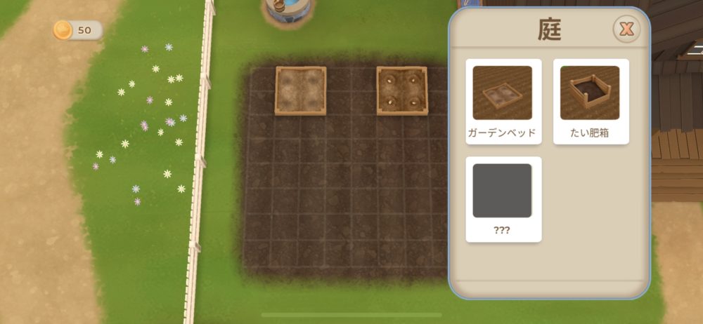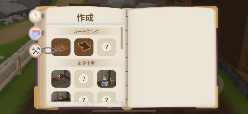 こちらはガーデニングや道具小屋で作成できるものの一覧だ。最初は花や野菜を育てることや、たい肥づくりしかできないが、ストーリーを進めていくことで、収穫したものを加工したりと、出来ることが増えていく。